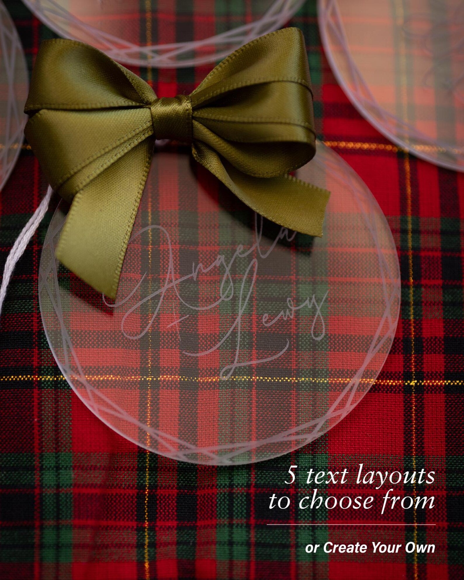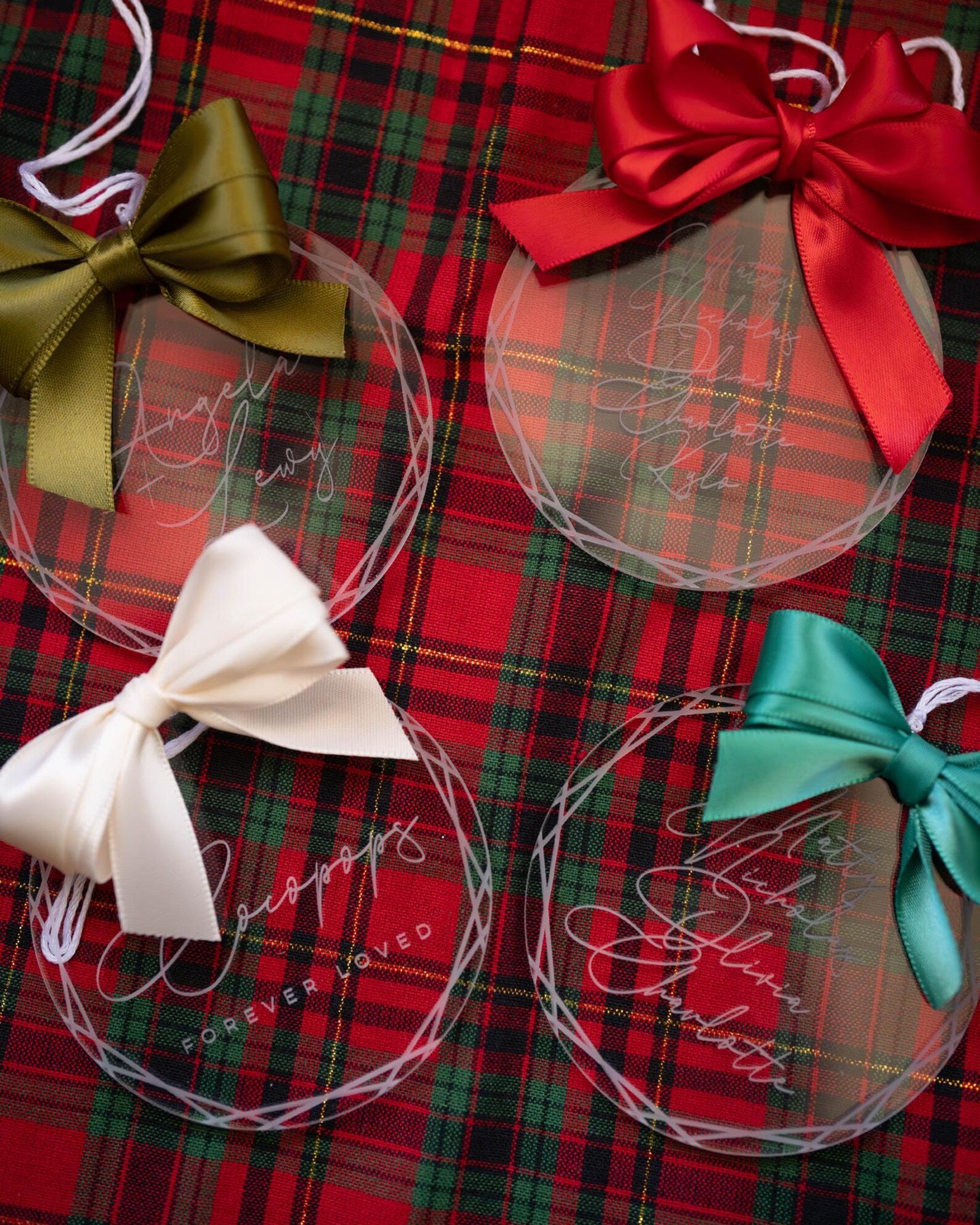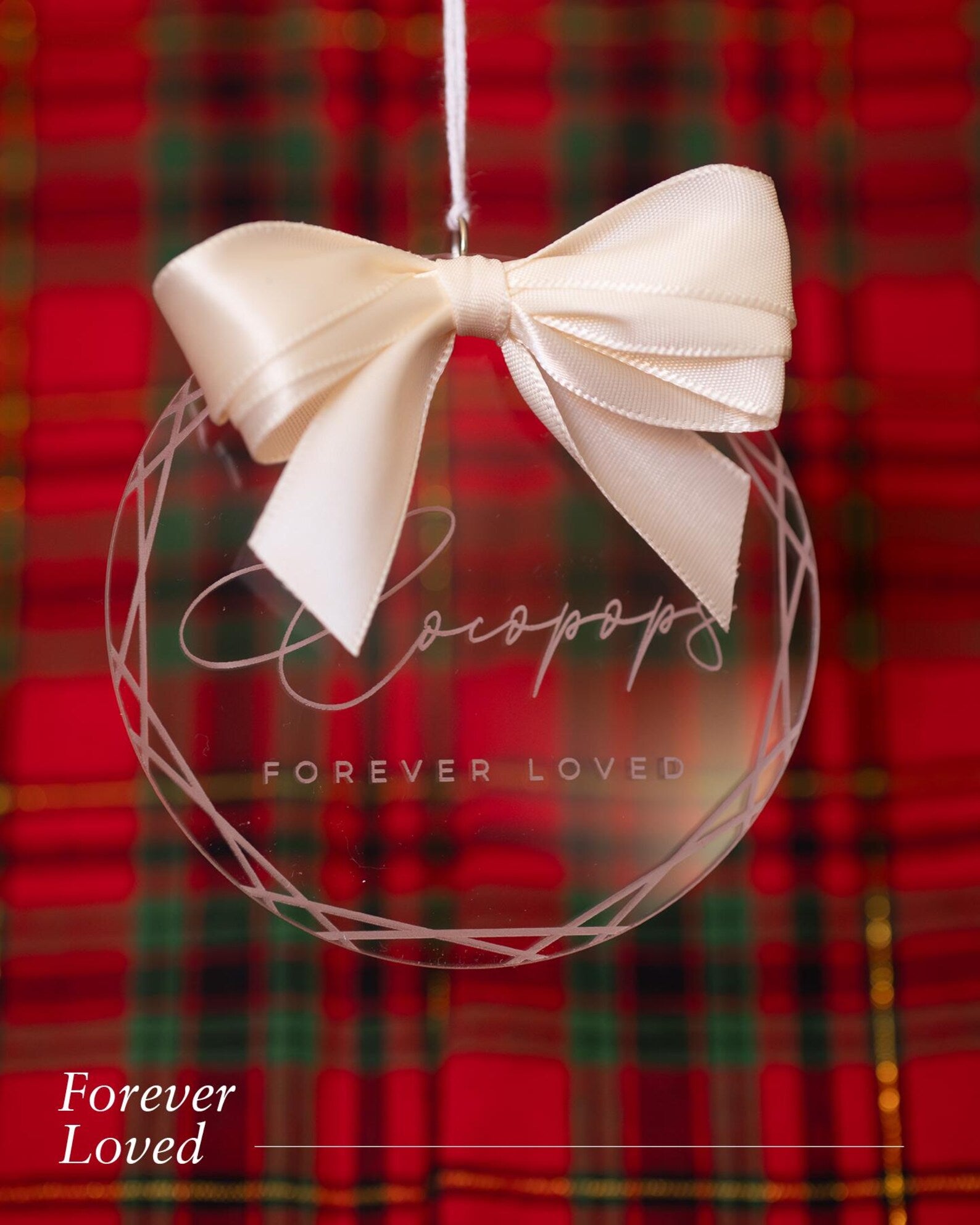 Add a touch of elegance to your Christmas tree with these beautifully engraved clear acrylic ornaments, personalised with your choice of name, family details, or heartfelt message. Each ornament is delicately engraved and finished with a luxurious satin bow — the perfect blend of modern and timeless holiday charm.