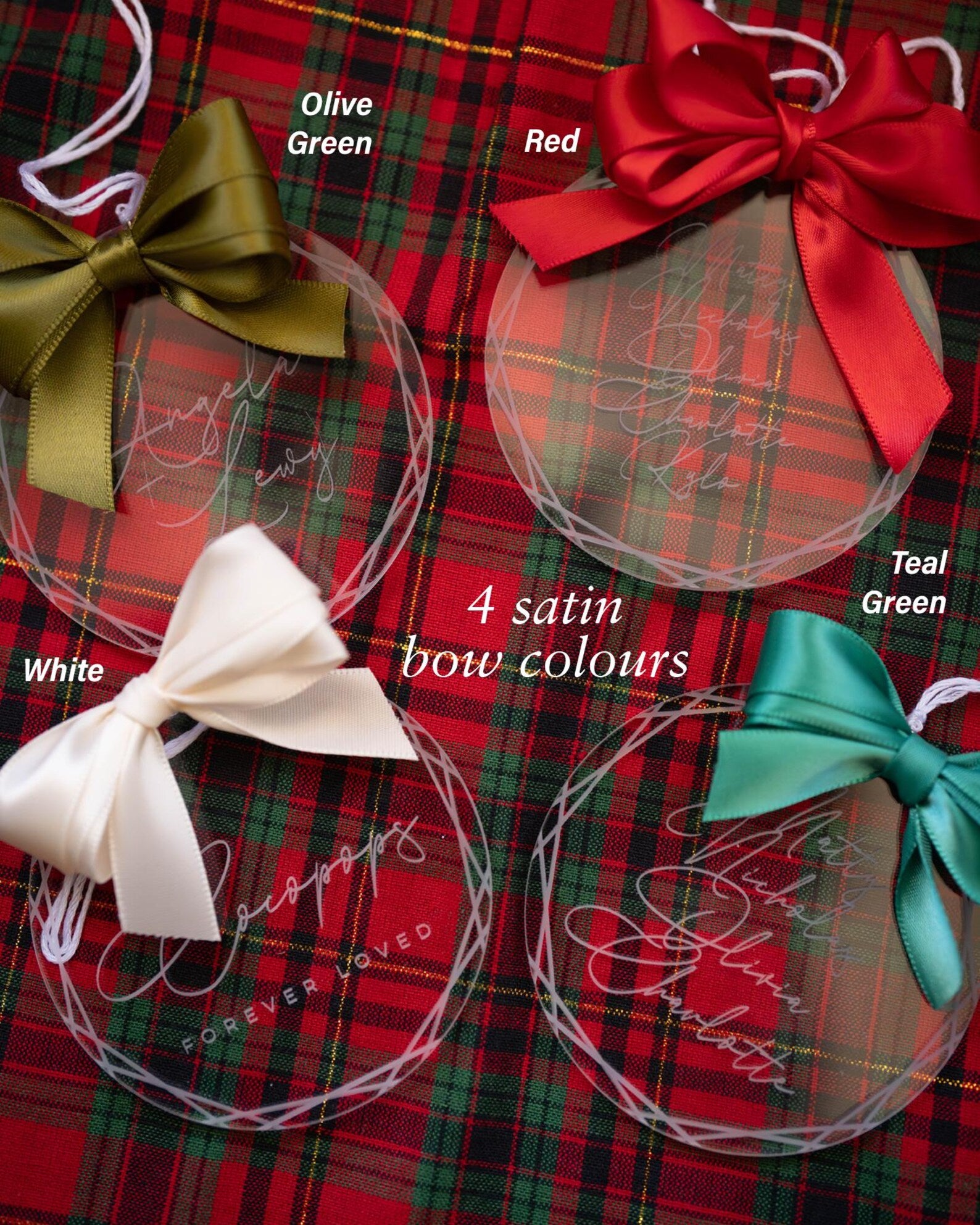 - Four satin bow colours – Red, Olive Green, Teal Green, or White